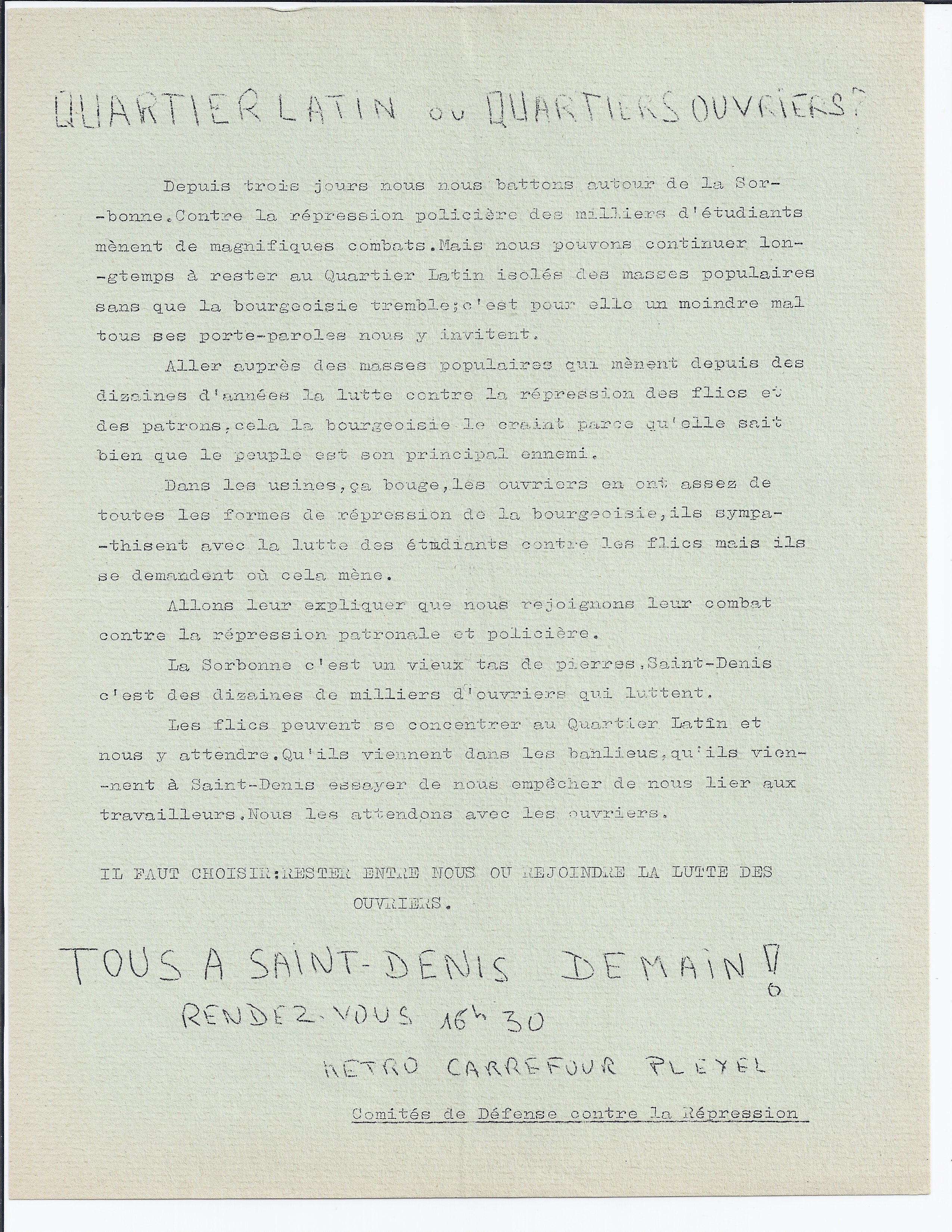 The cops may congregate in the Latin Quarter, and we can wait for them there. Let them come to the suburbs, let them come to Saint-Denis to try to prevent us from linking up with the workers. We will wait for them with the workers.