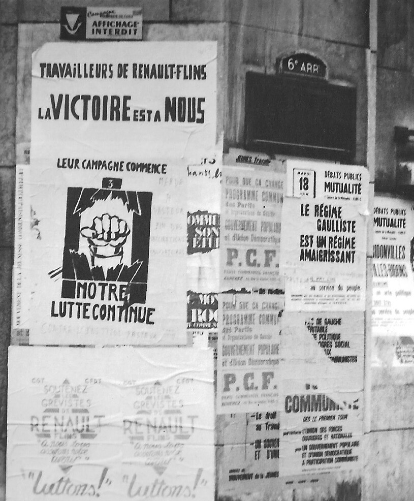 Brown-black screenprint on newsprint (Atelier Populaire stamp)