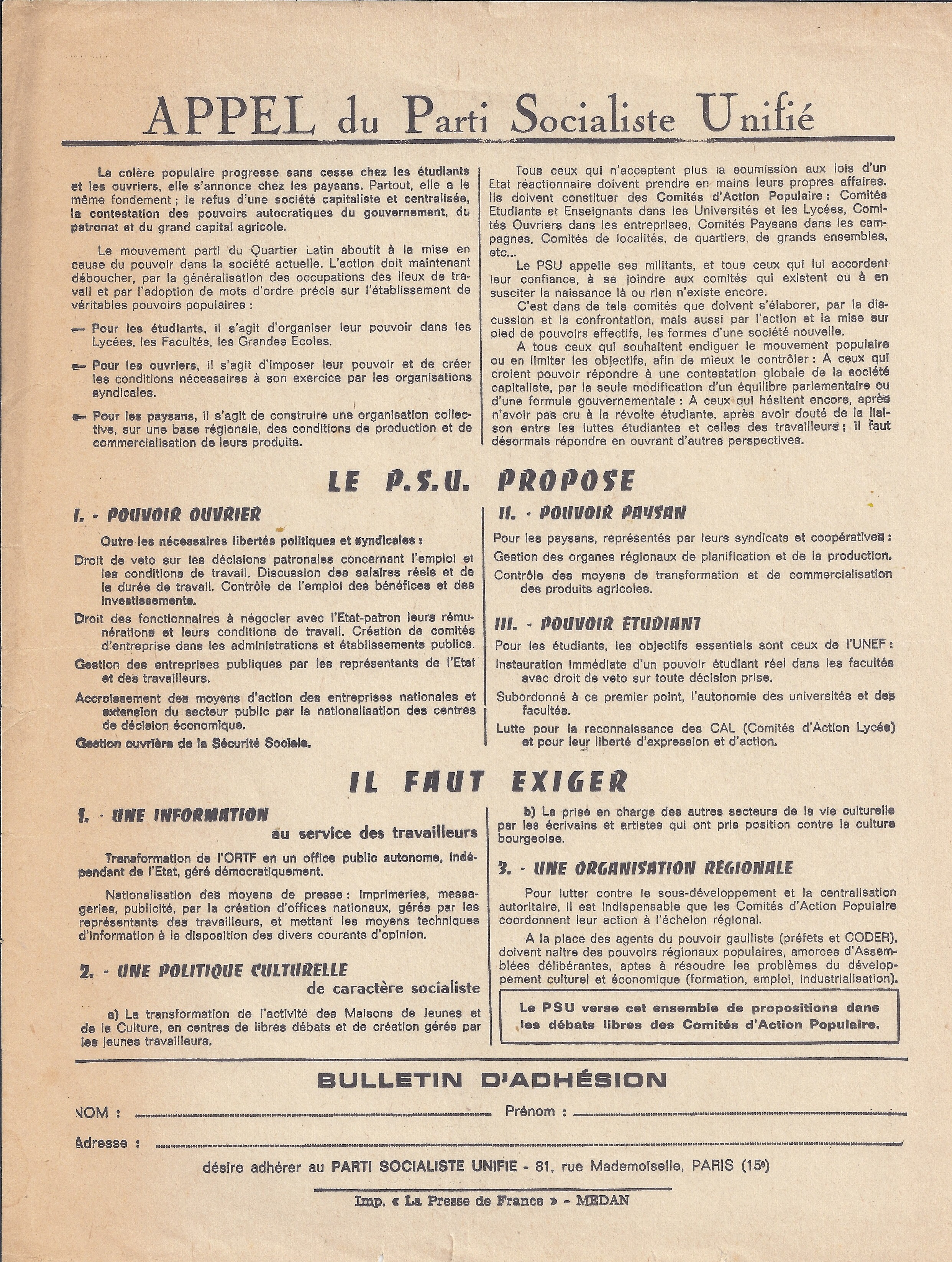The PSU calls on its militants, and on all those who have confidence in it, to join existing committees or to speed up their creation where they do not exist. It is in such committees as these that the form of a new society should express itself, through discussion and confrontation, but also through action and the setting up of effective powers