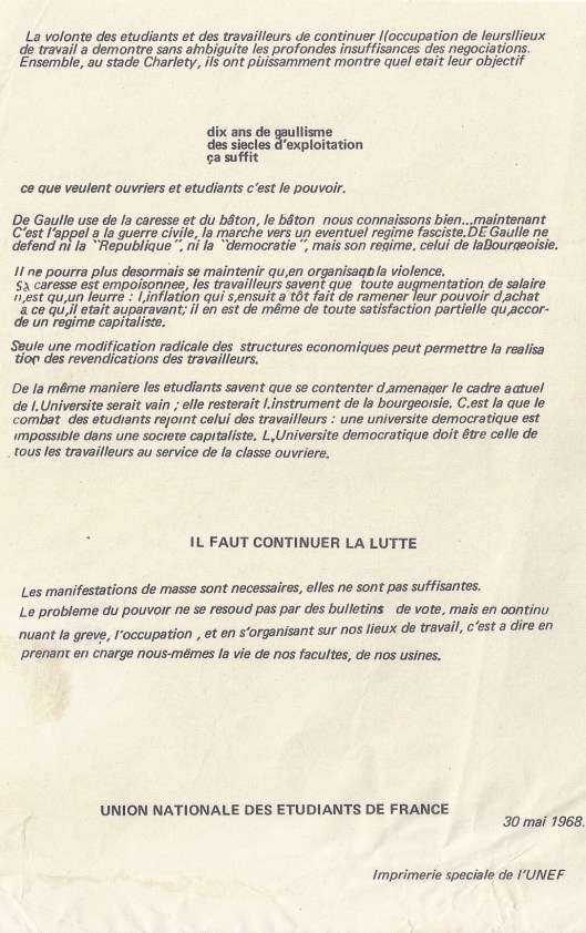 Tract – “The Struggle Must be Continued” (30 May 1968 – UNEF)