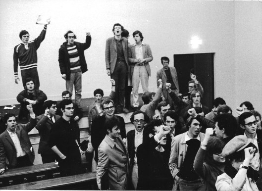 In the Parisian suburb of Nanterre, as in many of the university cities throughout the world, the students are in turmoil. The reasons for their agitation are variable, it’s rather a matter of tension related to a certain anxiety over the future. In our photo the extremist students of Nanterre have occupied the great amphitheatre of the Faculty and are demonstrating loudly, singing revolutionary songs.