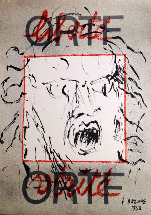 This is one of 4 lithographs Asger Jorn (ex-Cobra, ex-Situationist International) produced to be sold in support of the student movement. The 4 were actually produced on a single sheet which was cut – hence the variable dimensions of every copy (the print size, though, is obviously consistent).