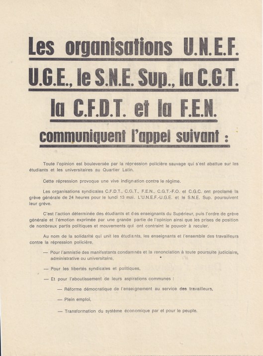 Tract – “The organisations of the U.N.E.F, U.G.E, the S.N.E.Sup, the C.G.T, the C.F.D.T and the F.E.N. make the following call :” (12 May 1968 – UNEF, SNESup, CGT, CFDT, FEN)