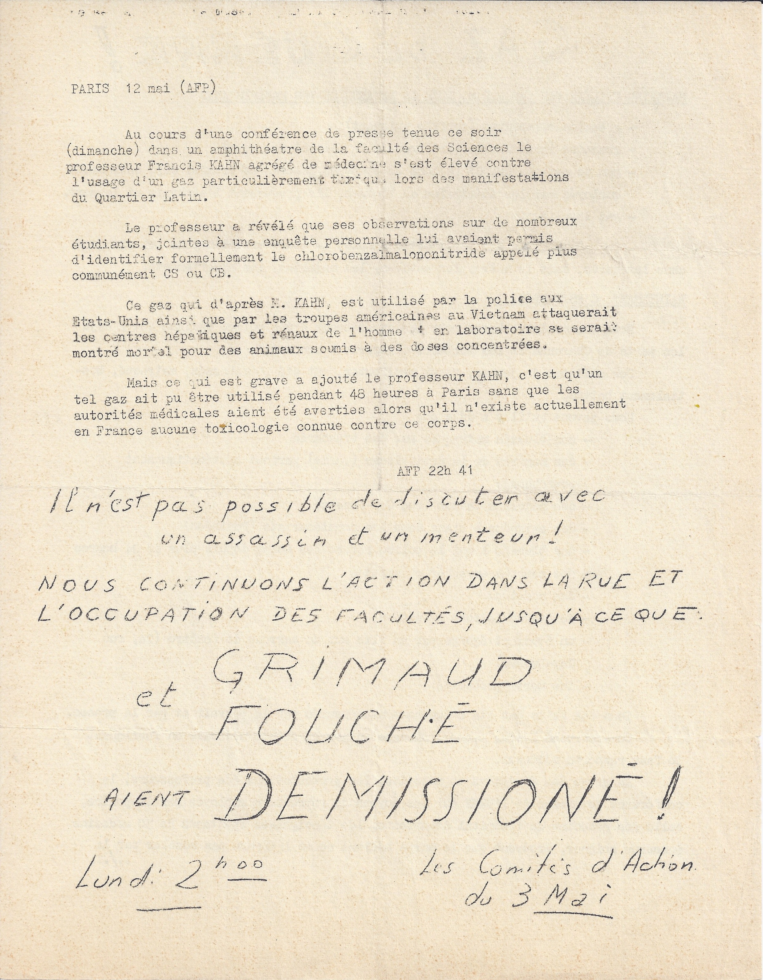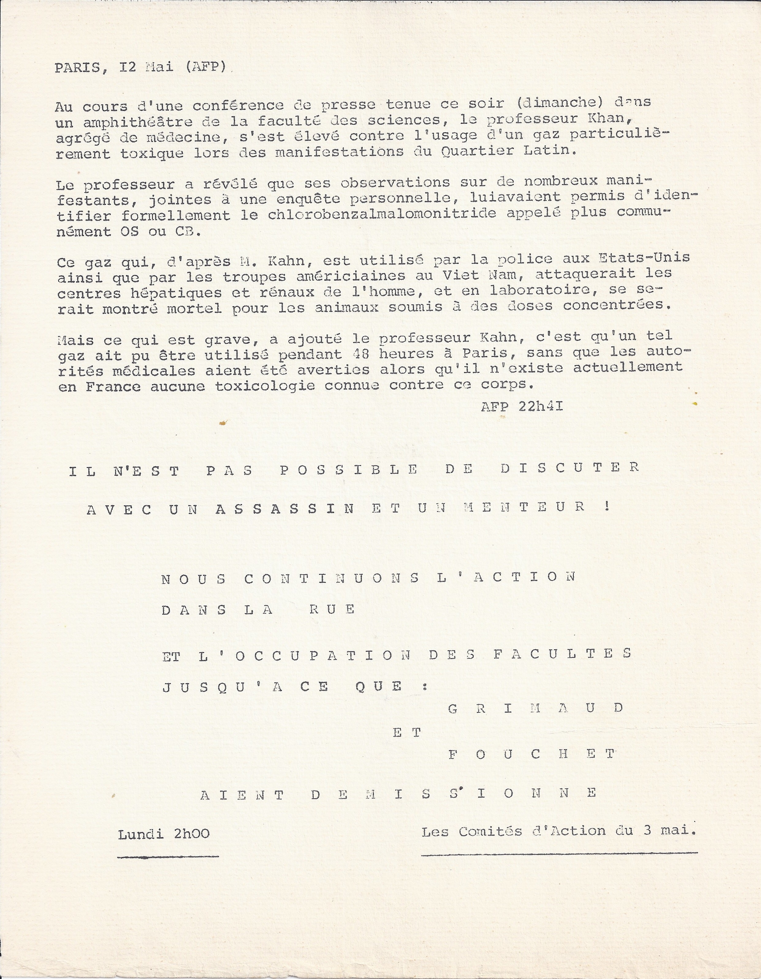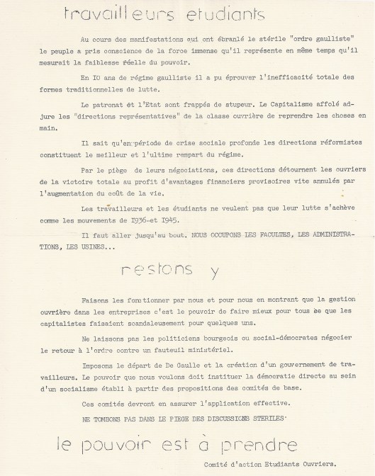 This morning L’Humanité says it is the student provocateurs that are at the origin of the violence. This is a lie. It was the workers of Flins (there were 8,000 of them) who sent for the students. It was the CRS, by their scandalous presence in the factory and the surrounding area, who provoked the workers of Flins. The students who wish to retake the Sorbonne understand the workers of Flins who wish to retake their factory: that’s why they were yesterday and are still at the side of the workers in the face of the repression of the bosses and the police.