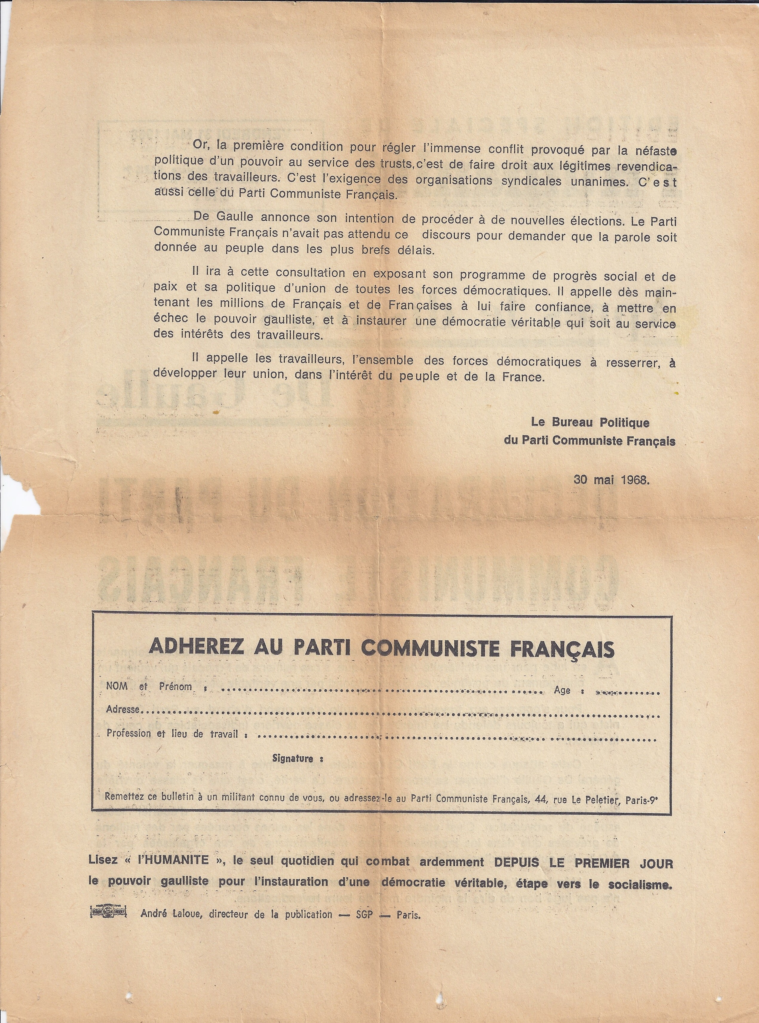 The Party will go to this compaign explaining its program of social progress and peace and it’s policy of the democratic unity of all forces. It now calls upon the millions of Frenchmen and Frenchwomen for their trust, to defeat the Gaullist government; and to establish a true democracy that serves the interests of workers.