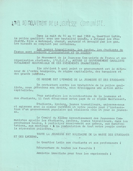 In the Latin Quarter, on the night of May 10 and 11 1968, the Gaullist police attacked students with unprecedented brutality. The students were pummelled, charged, choked and blinded by gas. Hundreds were wounded.