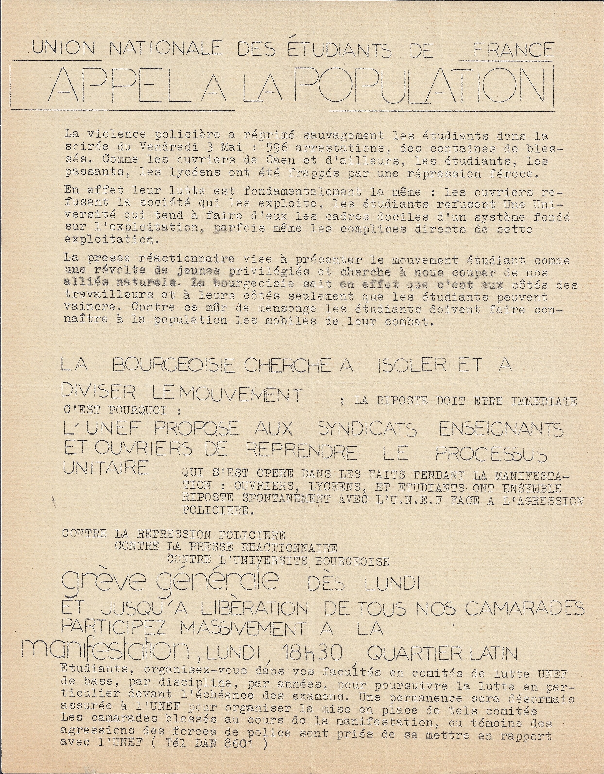 At the moment when de Gaulle is planning to make the working class and, to begin with, young workers and young intellectuals, pay the price for the rationalisation of French economy, at the moment when layoffs are increasing, when unemployment is hitting hundreds of thousands of young workers, when Peyrefitte is preparing to exclude 300,000 students from the University, THE FEDERATION OF REVOLUTIONARY STUDENTS DECLARES: