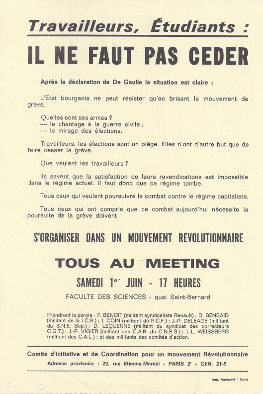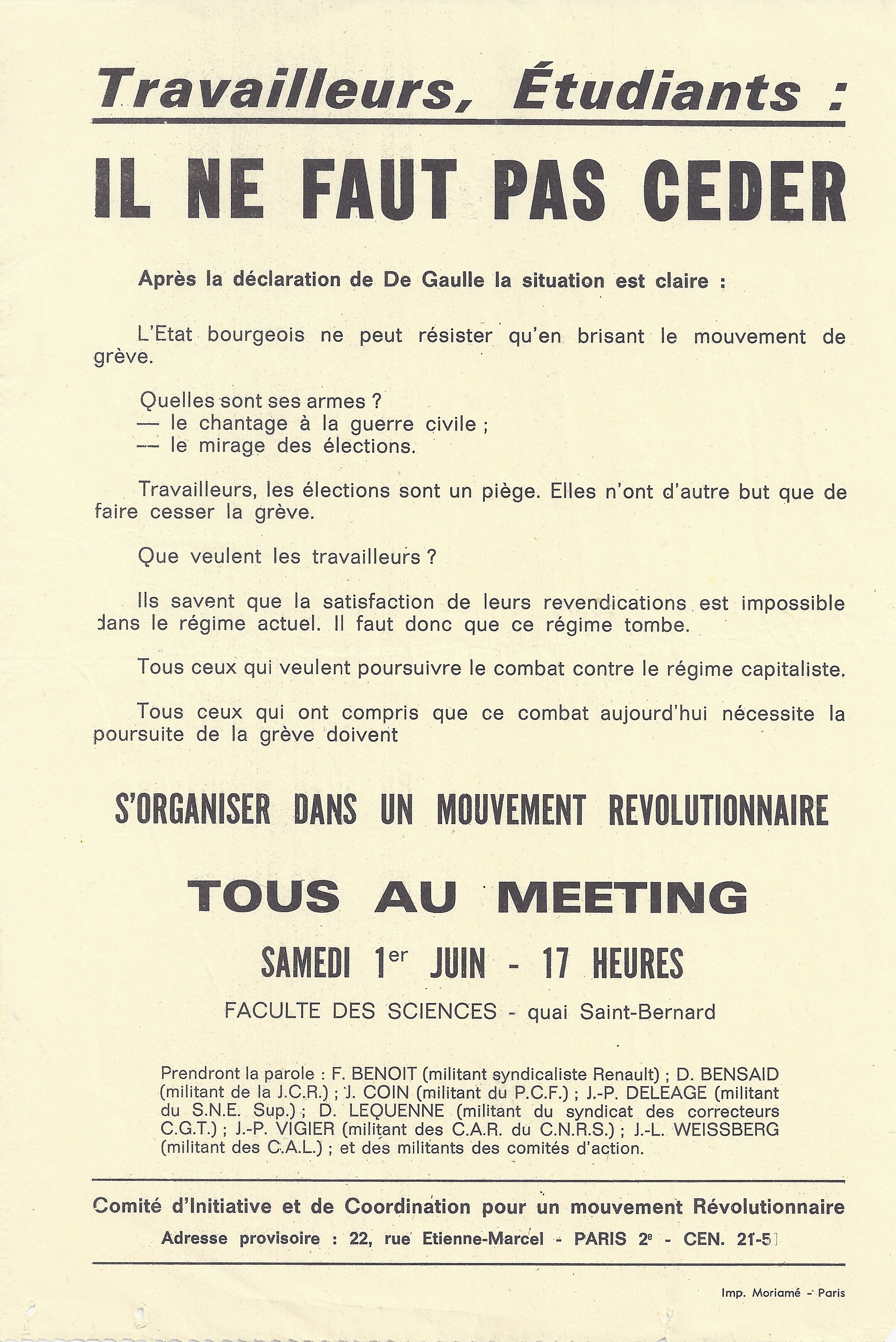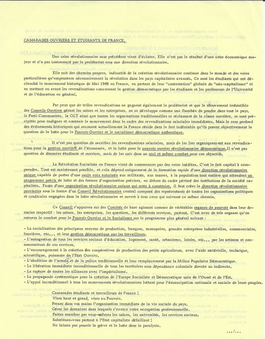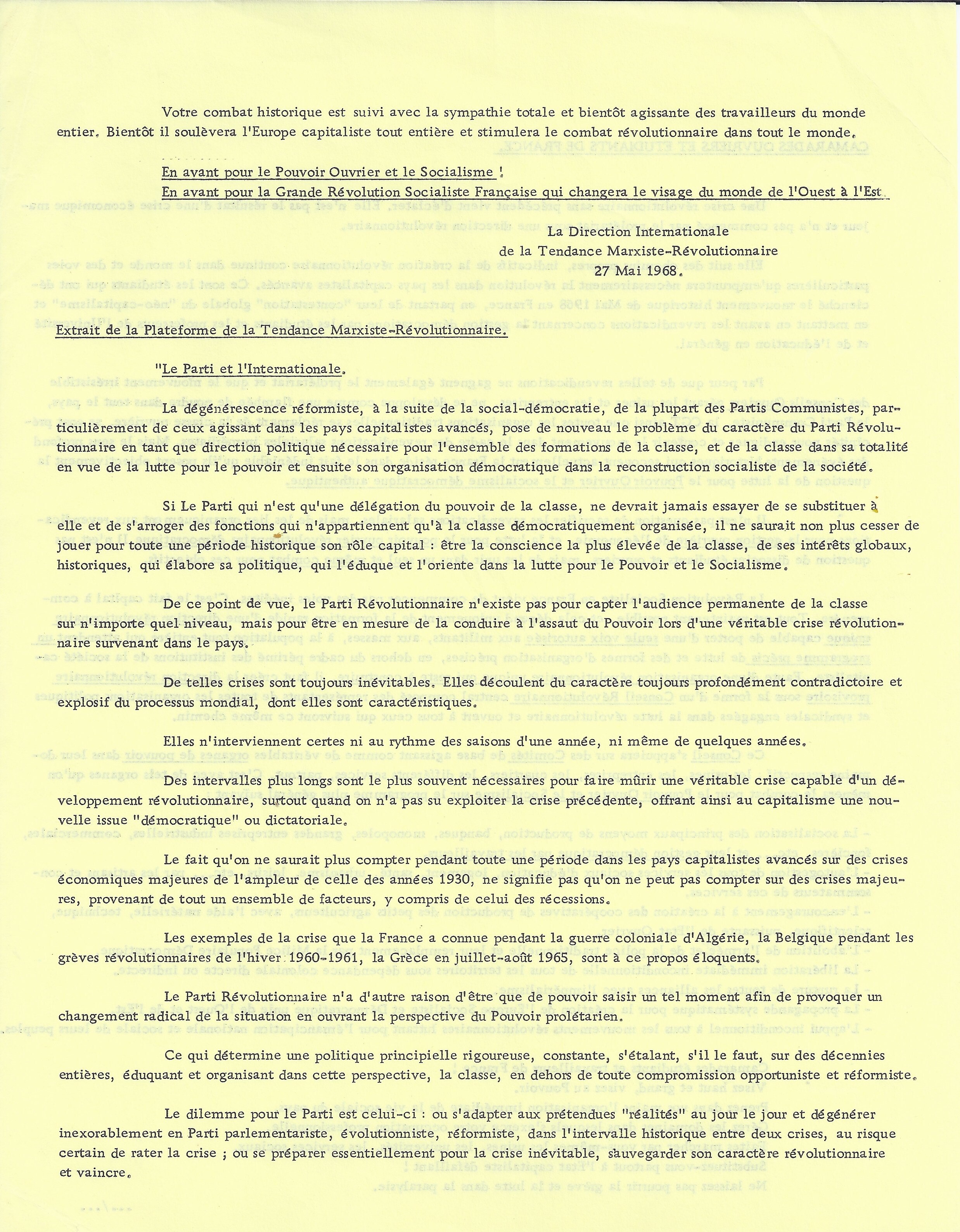 The Socialist Revolution in France has just begun, in an unprecedented way. This is the essential fact to understand. Everything is now possible and depends entirely on the quick formation of a united revolutionary leadership capable of speaking with the authority of one voice to militants, to the masses and to the whole population, which is waiting for a precise plan of struggle and precise forms of organization, which will go beyond the obsolete framework of the institutions of capitalist society. Because there is not yet a united revolutionary organization, the provisional revolutionary leadership must be created in the form of a central Revolutionary Council, made up of representatives of all the political and trade-union organizations committed to the revolutionary struggle and open to all those who will follow this path.
