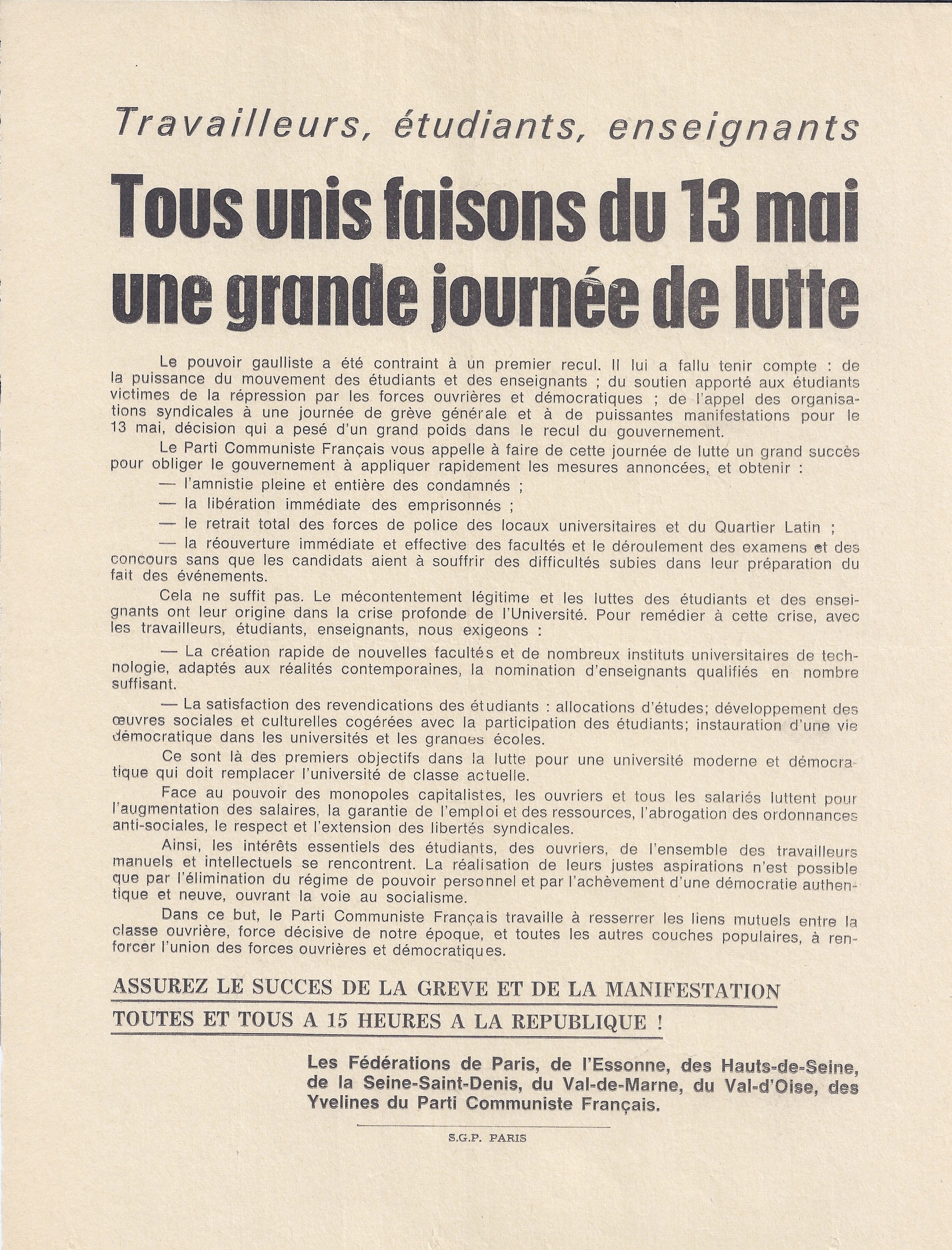 The French Communist Party is calling on you to make this day of struggle a great success, to compel the government to quickly implement the announced measures, and obtain: