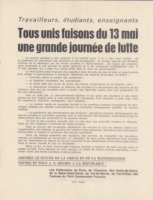 The Gaullist government has been forced to make its first retreat. It had to consider: the power of the students’ and teachers’ movement; the support of the workers and democratic forces for the student victims of repression; and the call of trade unions for a general strike and powerful demonstrations for May 13 – which is a decisive factor in the government retreat.