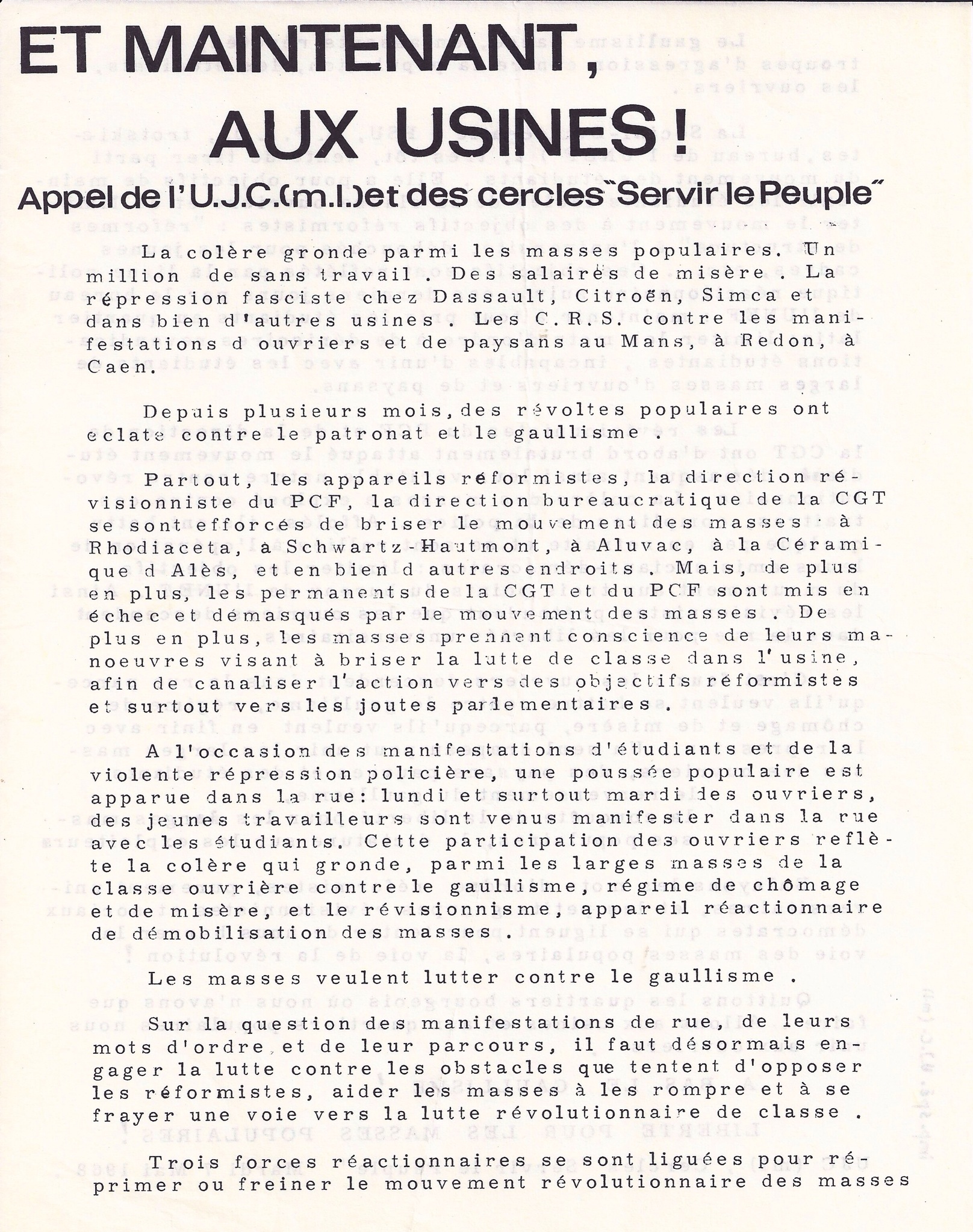 On Monday 13 May workers and students, en masse, gave proof of their immense strength. 13th May was an great day of struggle against Gaullism. Workers and progressive students DEMONSTRATED AGAINST GAULLISM. It is no longer a question of fighting for small demands – bourgeois irrelevancies. The Gaullist state currently wants TO BREAK THE TIDAL WAVE raised against it and all reactionary forces. The Sorbonne? It is open again. The freedom of our comrades? Workers and students have demanded it.