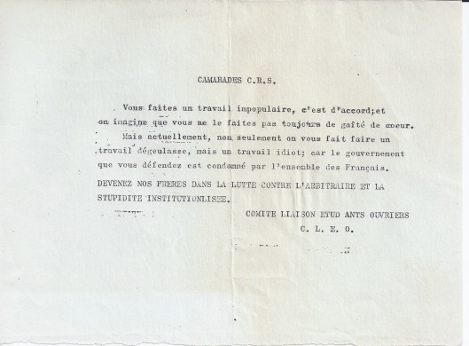 Wednesday 8 May: A security detail is imposed to control this third demonstration. We vow to march on the Sorbonne. Confident, the demonstrators trust the directives of the security detail who planned and organised our defeat by calling for a shameful dispersion when faced by the cops.